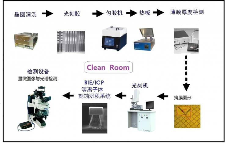 • 光刻工艺:涂胶,光刻(紫外泛曝光机,无掩模光刻机),显影,烘烤。对应的光刻胶:正胶,负胶;