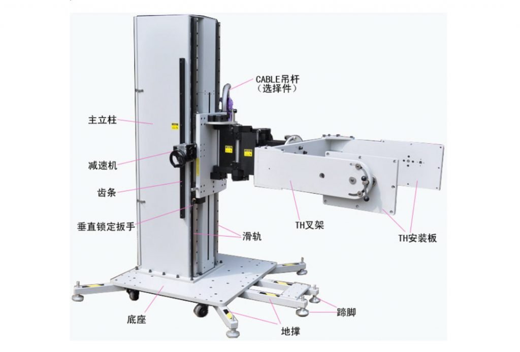 主⽴柱内部有配重箱,通过链条与滑轨上安装的部件连接。打开后⻔,增减配重块,可以使两端达到平衡。TH 叉架以及TH 安装板是按不同的Testhead适配的。Cable 吊杆是选装件,某些情况下不需要。